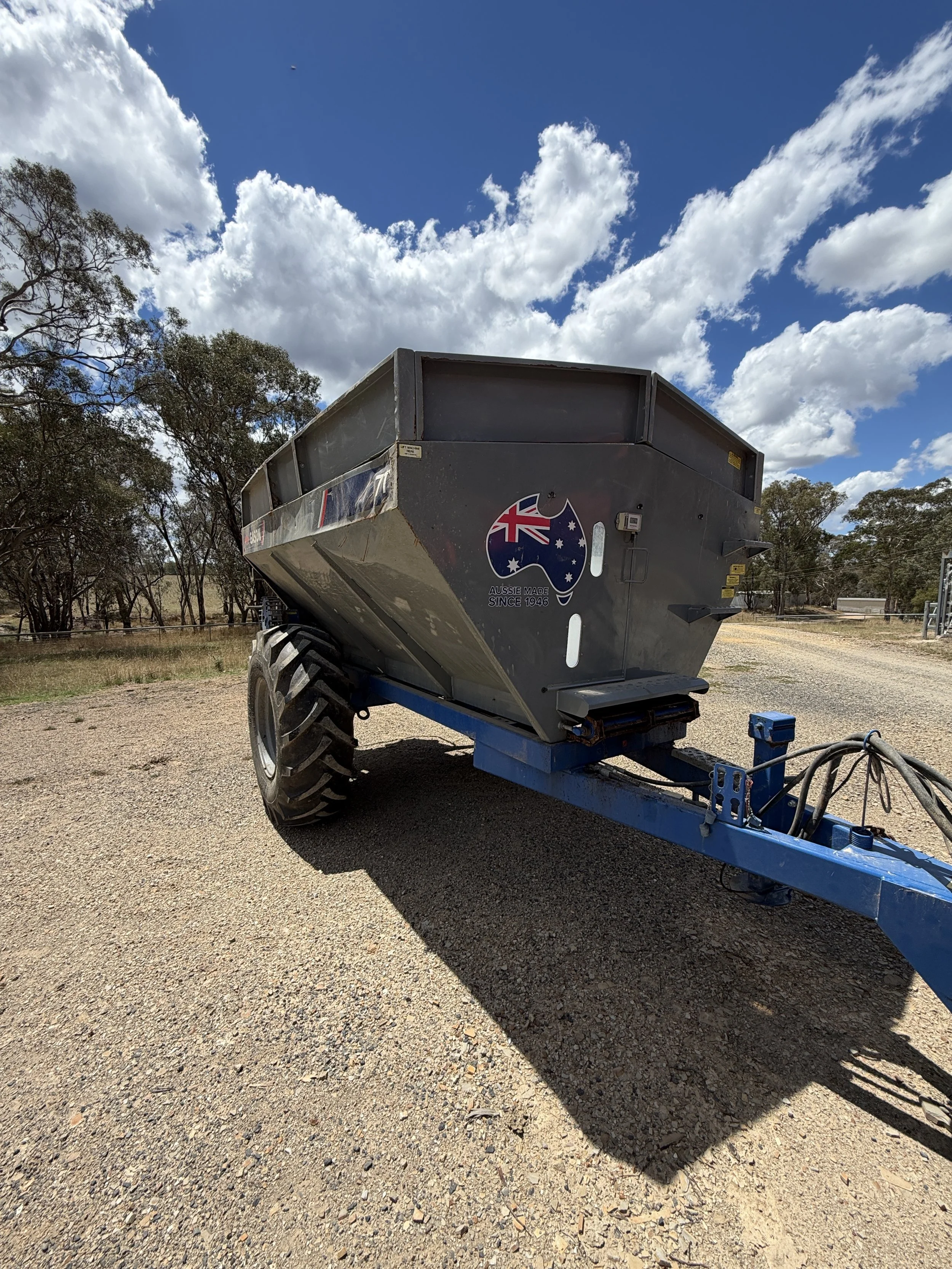 Gason 7370 7T Spreader. This machine is equipped with the following, 7.1T Carrying capacity pending product, Hydraulic Driven Spinners, Ground drive, spread width 24-30M, Slat Style feed chain, 18.4R26 tyres, Year: 2023 ( Delivered April 2024 ) Capacity: 7.1T Spread Width: 24 - 30M One Owner unit. The biggest down side to this unit is simple the little mishap it had with an object slightly bigger then the spreader its self. all the damage is in the photos, this has not affected the units performance at all. this is good versatile and solid spreader. Great entry position for anyone wanting to get into their own unit to get the job done on time. Available now. Price Includes GST. Please note more pictures under listing on farmmachinerysales.com.au and tradefarmmachinery.com.au For more Information or to arrange an Inspection Call Darren today. 0427200302
